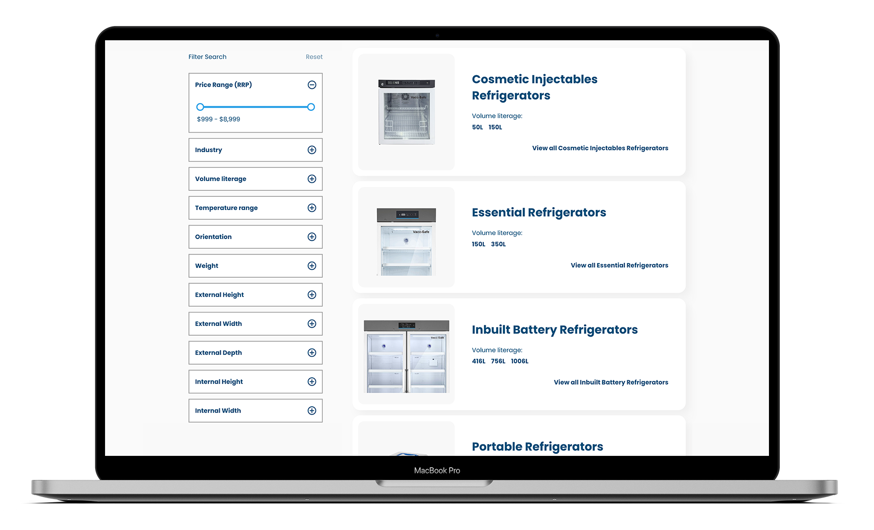 So we built a custom filtering system from scratch. Each product line is presented in a simple, scannable card with a link to each product SKU, while a behind-the-scenes custom PHP framework connects all product SKUs to their unique attributes, allowing filtering through custom Javascript. Users can then apply filters for things like temperature range, storage volume, or power source and instantly see the exact product SKU that fits. If no SKU within a product line qualifies, the entire card disappears, keeping results clean and relevant.